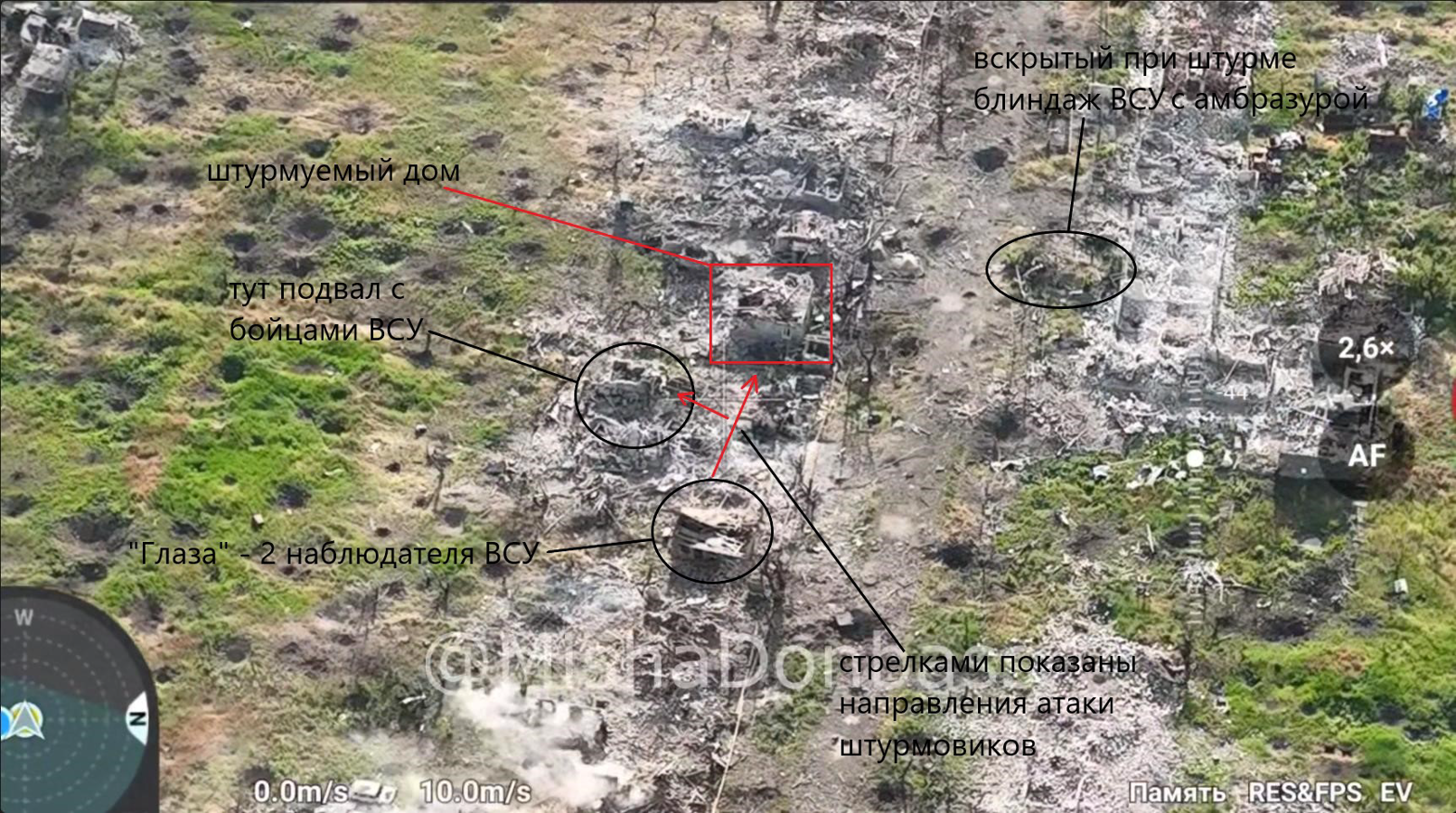 Источник: https://t.me/MishaDonbass/942 "Данный материал предназначен в первую очередь для обывателя, вопрошающего: "Почему так долго?" Марьинка - стратегически важный (с точки зрения пиара) населённый пункт. Его утрата, по мнению киевских утырков, может сильно деморализовать общество и ВСУ. Как следствие - за каждый подвал цепляются, упираются, не считаясь с потерями. Если мы не стёрли в пыль здание - это сделает ВСУ. Марьинка - феномен этой войны. Схожая ситуация наблюдалась в пригородах Дамаска - Джобаре и Дарайе (держали оборону террористы Ан-Нусры). С той разницей, что там хотя бы были дома в несколько этажей. Здесь же - сплошные руины и подвалы. До освобождения Марьинки осталось взять пару сотен метров. Трудных и кровавых метров. Почти под каждым сложенным домом - лежат тела бойцов ВСУ. И всё ради недопущения информационной "зрады". ПС: все штурмовики остались живы. Часть - с пулевыми ранениями конечностей (руки ноги). Угрозы жизни нет." ___________________ 4ingis Xottaby4 Северная часть Марьинки, улица Леси Украинки, прямо на краю закраса. 0:24 – Укрытие ВСУ с бк (вроде бы дом №49, или соседний – 47.955213, 37.493229) 0:28 – детонация БК в этом укрытии 0:48 – «глаза» 2 наблюдателя ВСУ (дом №44 – 47.954945, 37.494896) (сразу же НП накрыт артударом) 1:00 – штурм начался (наши идут вот здесь 47.954937, 37.494901, уже за уничтоженной позицией вражеских наблюдателей) 1:25 – берём этот дом (дом №45 – 47.955003, 37.494622) 1:52 – весь штурм над бойцами кружат дроны врага 2:23 – подвал с бойцами ВСУ (в разрушенном доме или строении на заднем дворе участка №44) 2:46 – закинул гранату в подвал 3:50 – наши бойцы заняли дом 3:54 – попадание ствольной артиллерии ВСУ (во взятый дом) 6:27 – эвакуация раненых из взятого дома, приказ на отход с позиции 6:38 – Блиндаж ВСУ с подкопом под фундамент дома (через улицу, у дома №52 – 47.955265, 37.494597) Итог – дом был взят. Несколько бойцов, получив огнестрельные ранения конечностей, оказали друг другу первую помощь. Решение отойти на исходные позиции обусловлено ранениями и невозможностью немедленного подавления выявленных огневых позиций врага. ____________________________ "This material is intended primarily for the layman asking: "Why is it taking so long?" Mariynka is a strategically important (from the point of view of PR) locality. His loss, according to the Kiev imbeciles, can greatly demoralize society and the Armed Forces of Ukraine. As a result, they cling to each basement, they rest against it, regardless of losses. If we have not wiped the building to dust, the AFU will do it. Mariynka is a phenomenon of this war. A similar situation was observed in the suburbs of Damascus - Jobar and Daraya (Al-Nusra terrorists held the defense). With the difference that at least there were houses with several floors. Here there are solid ruins and basements. Before the liberation of Mariynka, it remains to take a couple of hundred meters. Difficult and bloody meters. Almost under every folded house - there are bodies of AFU fighters. And all for the sake of preventing information "zrada". PS: all the stormtroopers remained alive. Part - with bullet wounds of the limbs (arms and legs). There is no threat to life."