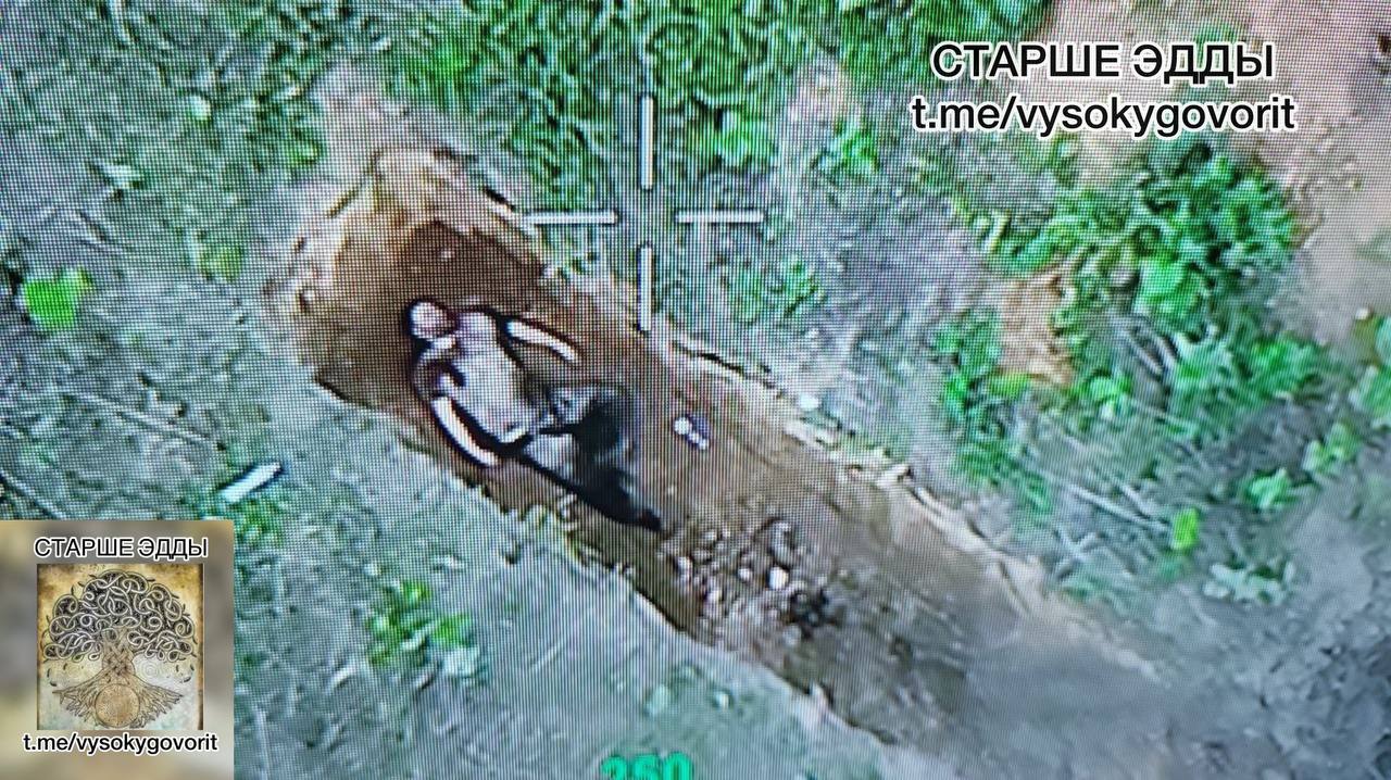 Источник: https://t.me/vysokygovorit/16308?single "Липцовское направление, Харьковская область. Место, где уже больше месяца идут тяжёлые бои и где противник, невзирая на потери, пытается выбить Северян. На видео попытка эвакуации тел, багги противника подрывается на нашей мине, какое то время продолжает ехать, далее на фото уже остановившейся багги и отползший в яму водитель. Отполз в яму и умер, впрочем туда ему и дорога."