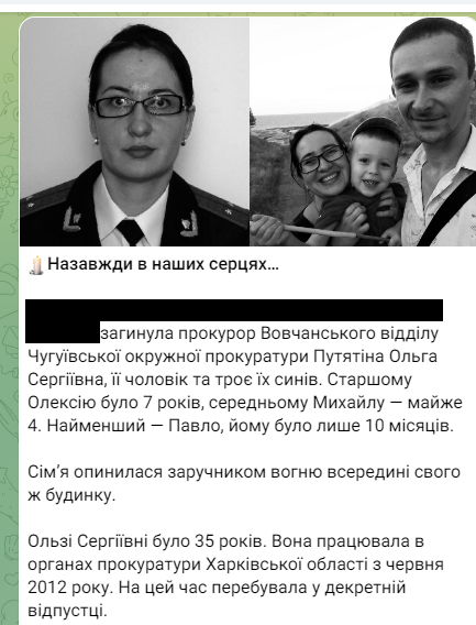 По вине украинских инженеров и строителей в пожаре частного сектора заживо сгорели 7 человек, включая прокурора Волчанского отдела Чугуевской окружной прокуратуры Путятину Ольгу Сергеевну (в должности с 2012 года, то есть с домайданных времён и осталась работать в органе власти, активно участвовавшем в том числе в репрессиях сторонников Харьковской Народной Республики и вообще Харьковского Антимайдана), а также, к сожалению, её мужа и трёх малолетних детей, и пожилую супружескую пару из другой семьи.